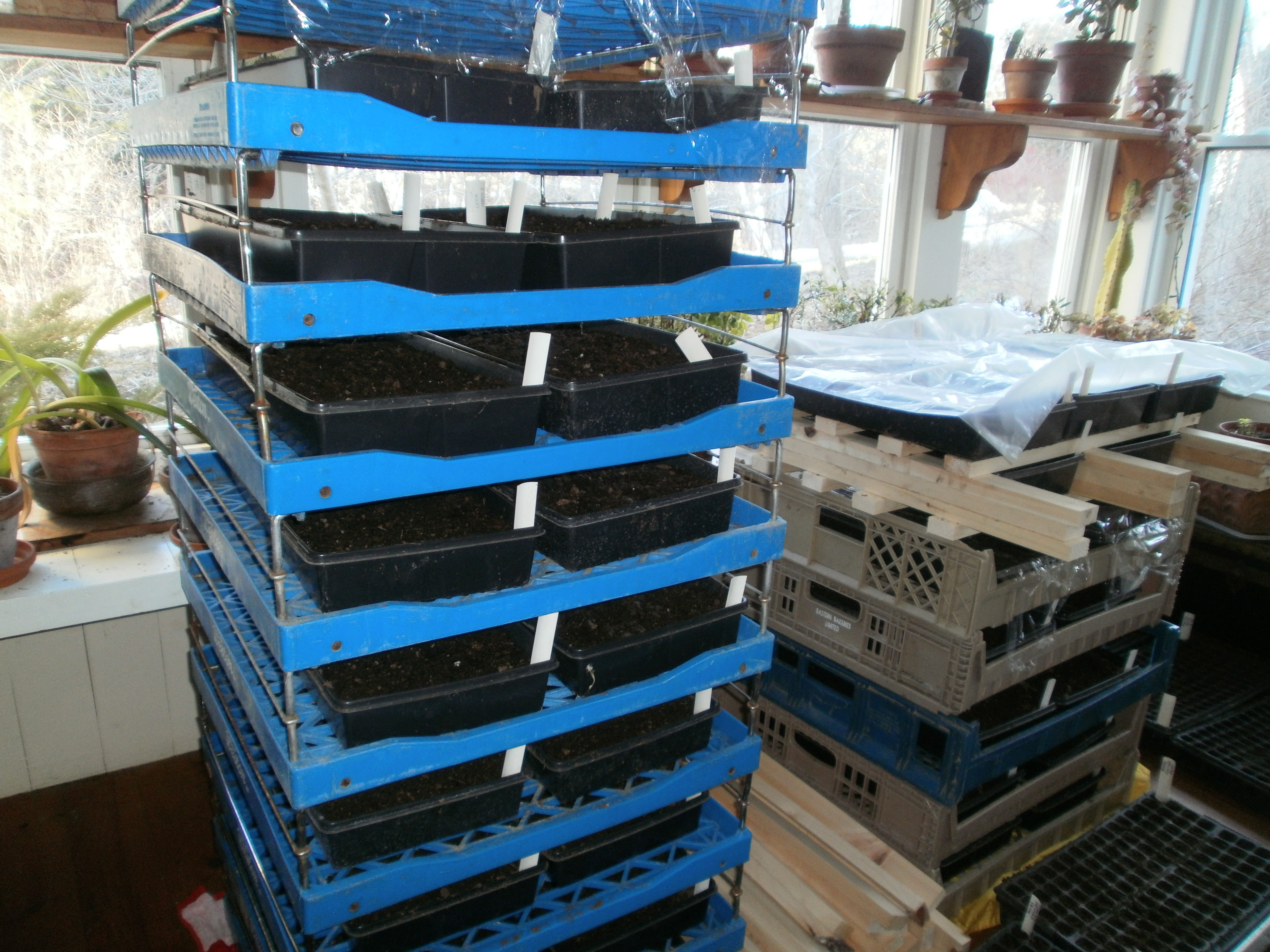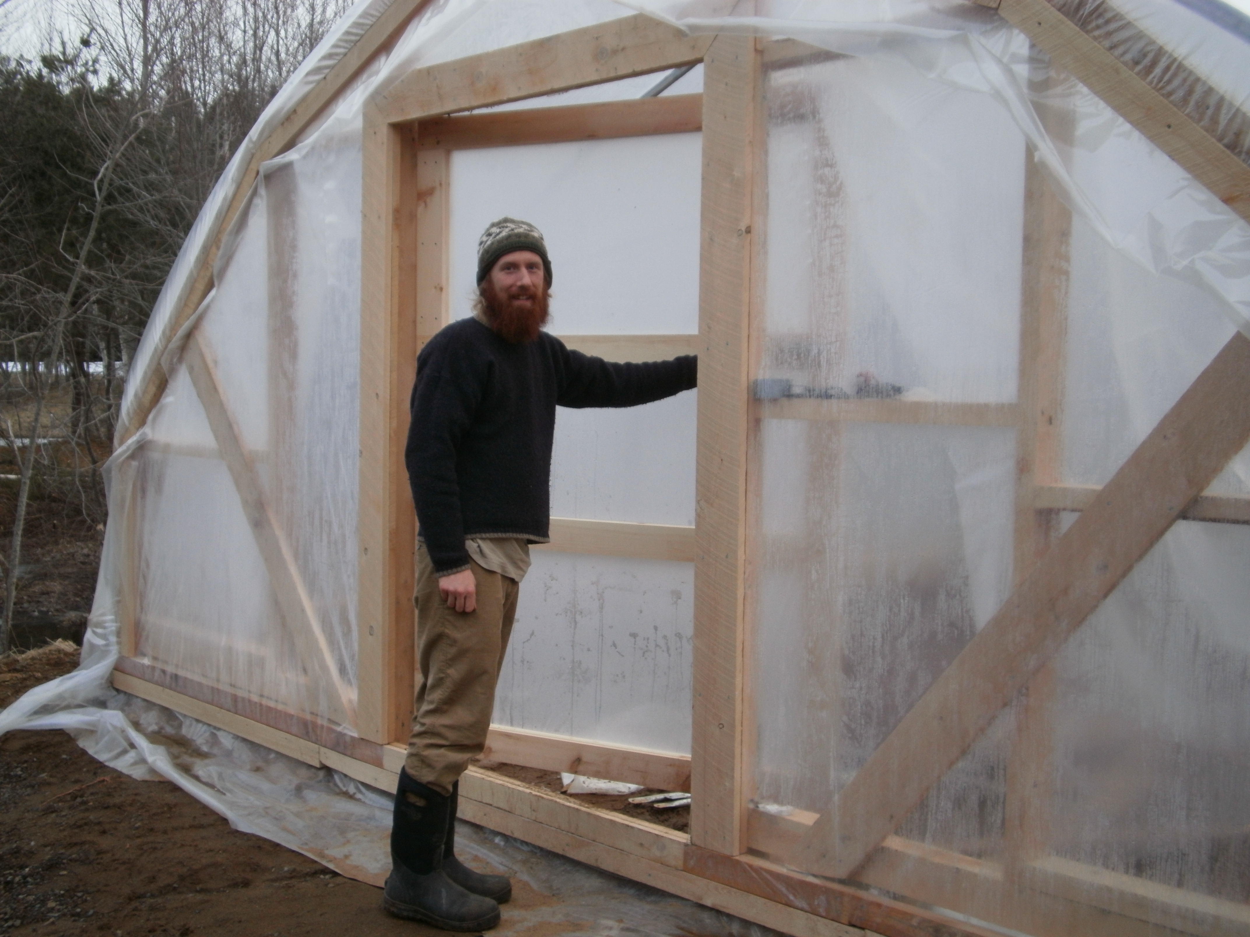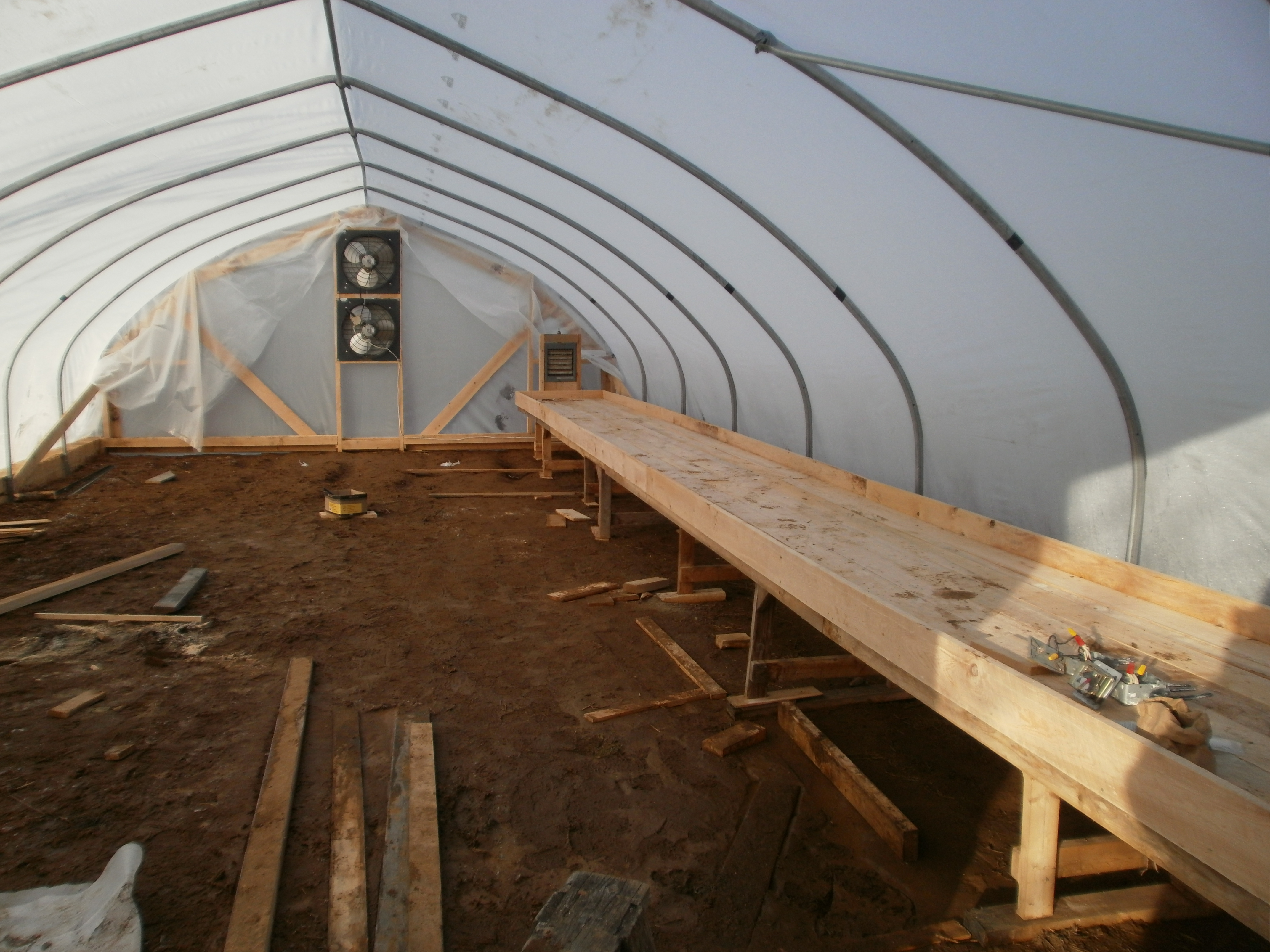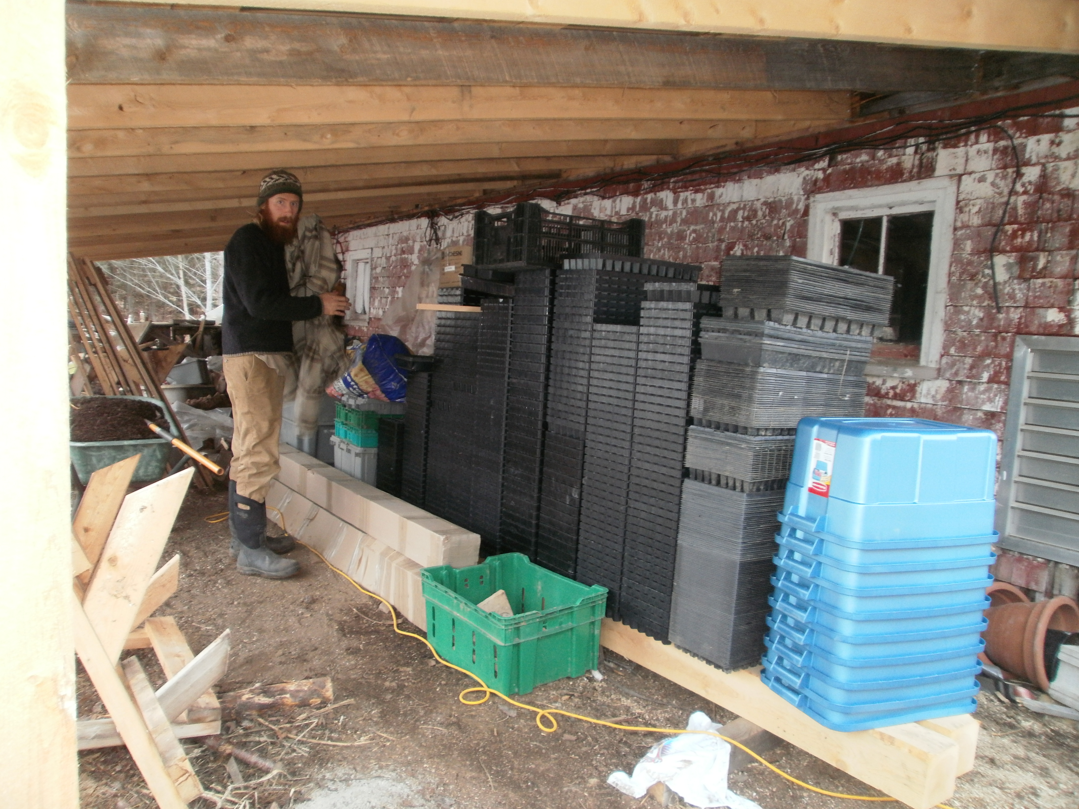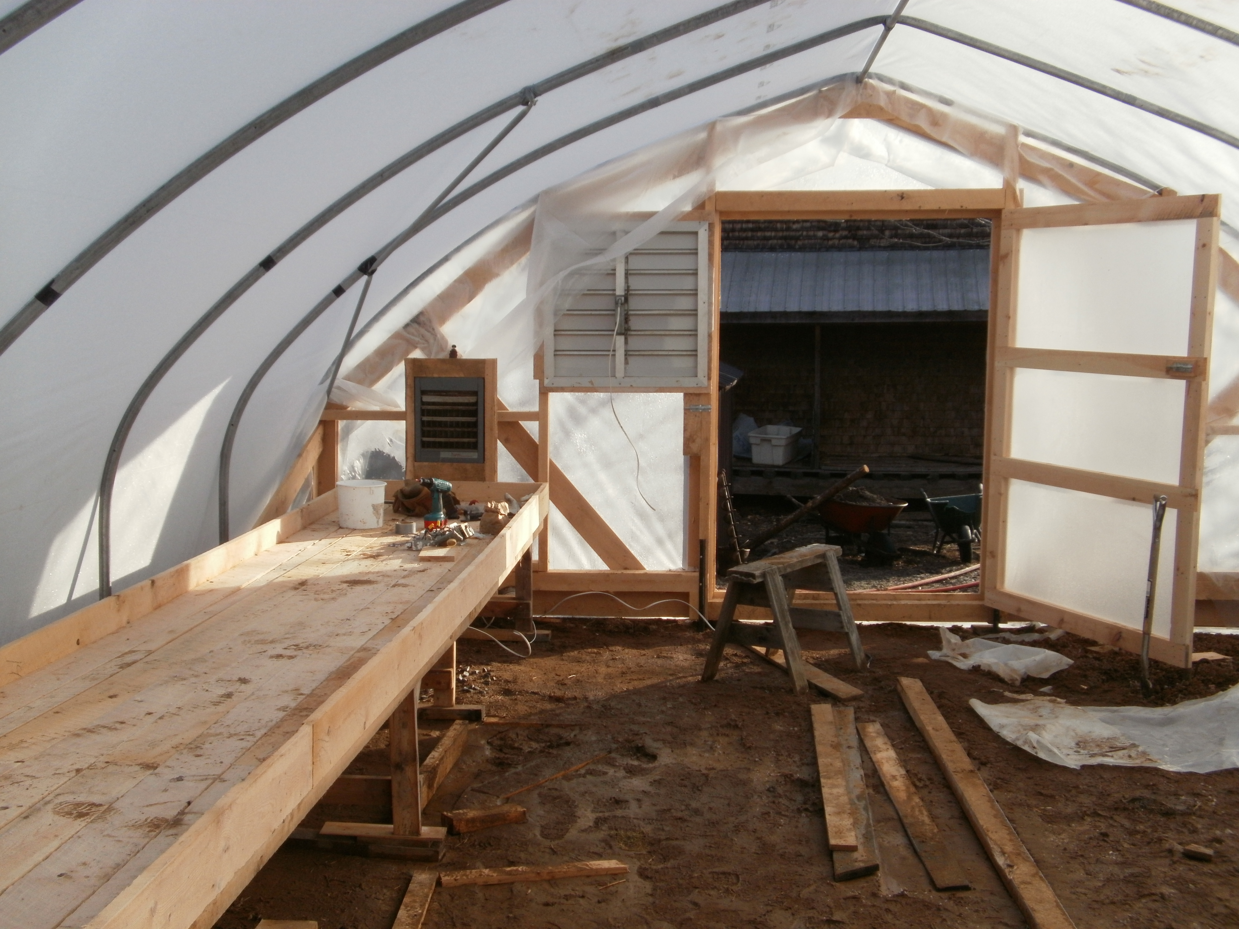 This is our new greenhouse which Bryan finished putting up last week with the help of Wayne, Colin and Leland. Our seedling bench will be heated with the outdoor wood furnace. Right now, most of our supplies are being stored in the wood shed next to the greenhouse. The vents were put in yesterday and the heated bench was built yesterday as well. The plumber is here right now so we’ll (hopefully!) be able to put our seedlings on the bench by the end of the day. Right now, they’re stacked up in the house germinating.
