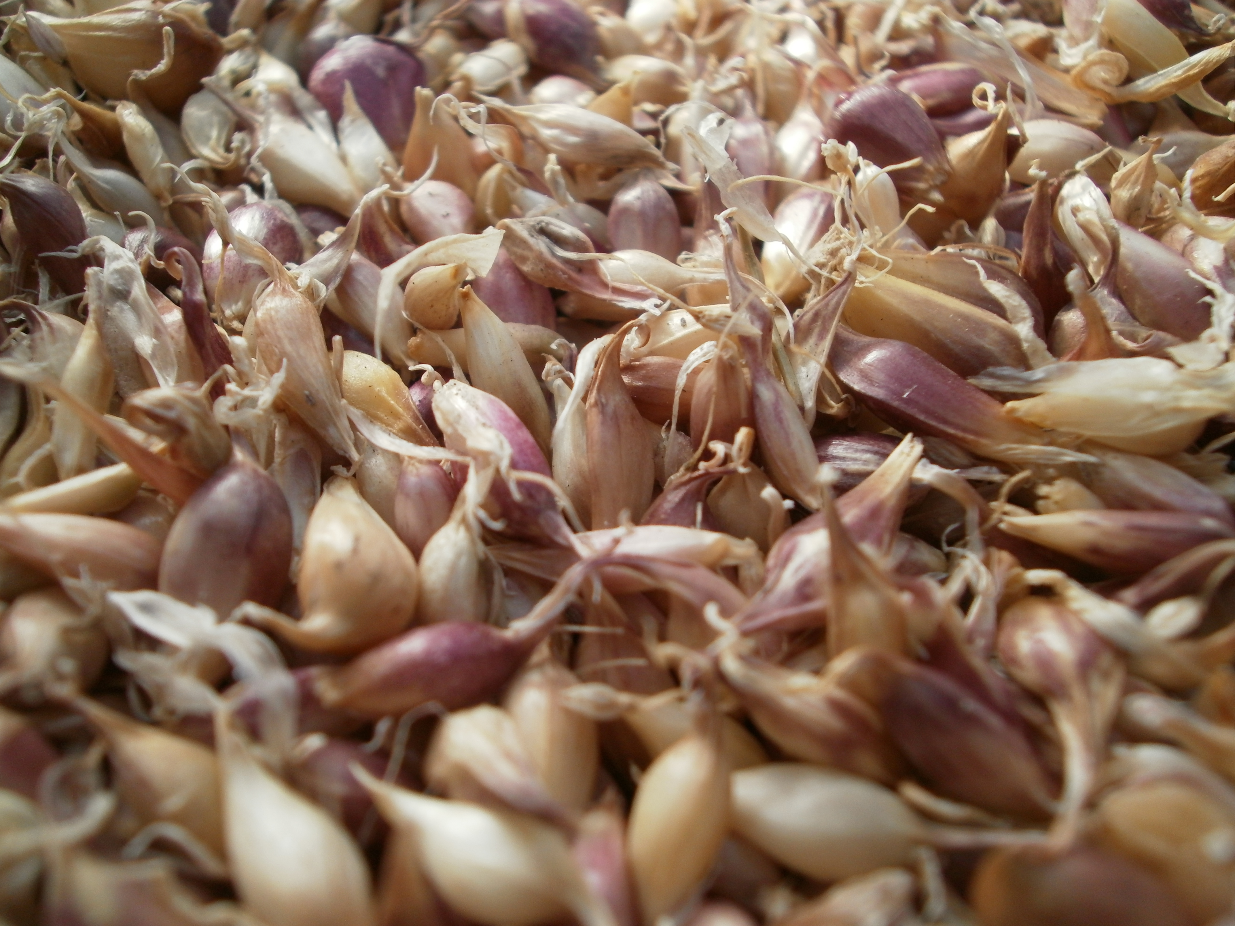 But all garlic doesn’t have to be propagated this way. Their are two main types of garlic: hardneck (Allium sativum ophioscordon) and softneck (Allium sativum sativum). Hardneck types produce a flower stock (often called the ‘scape’) from the plant that most growers remove so that energy goes into producing a larger, heavier bulb. However, if you let the flower stock continue to grow and mature, it produces tiny seed-like ‘bulbils’; clones of the parent plant that can be planted and grown out to be full-sized bulbs. Depending on the variety of hardneck garlic, it can take anywhere from 2 to 5 years (or potentially longer!) to obtain a full-sized garlic bulb from planting bulbils. Some are very tiny, around the size of a grain of rice, and some are larger, around the size of a pinky-fingernail.